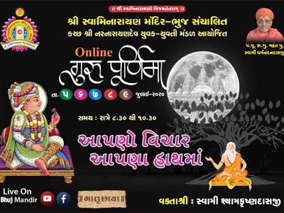 Kutch Shree Narnarayandev Yuvak-Yuvati Mandal Bhuj have organised a special Katha 'Our thoughts are in our control' to celebrate the auspicious occasion of Guru Purnima. The Sabha will be broadcasted live for devotees around the world.