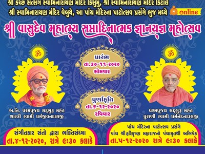 Shree Swaminarayan Temples in Eldoret, Kisumu, Nakuru, Kitale and Vibuye jointly celebrate their Patotsavs from Monday 30th November 2020 to Sunday 6th December 2020. Santo from Bhuj Mandir will be reciting the Shree Vasudev Mahatmya katha parayan.