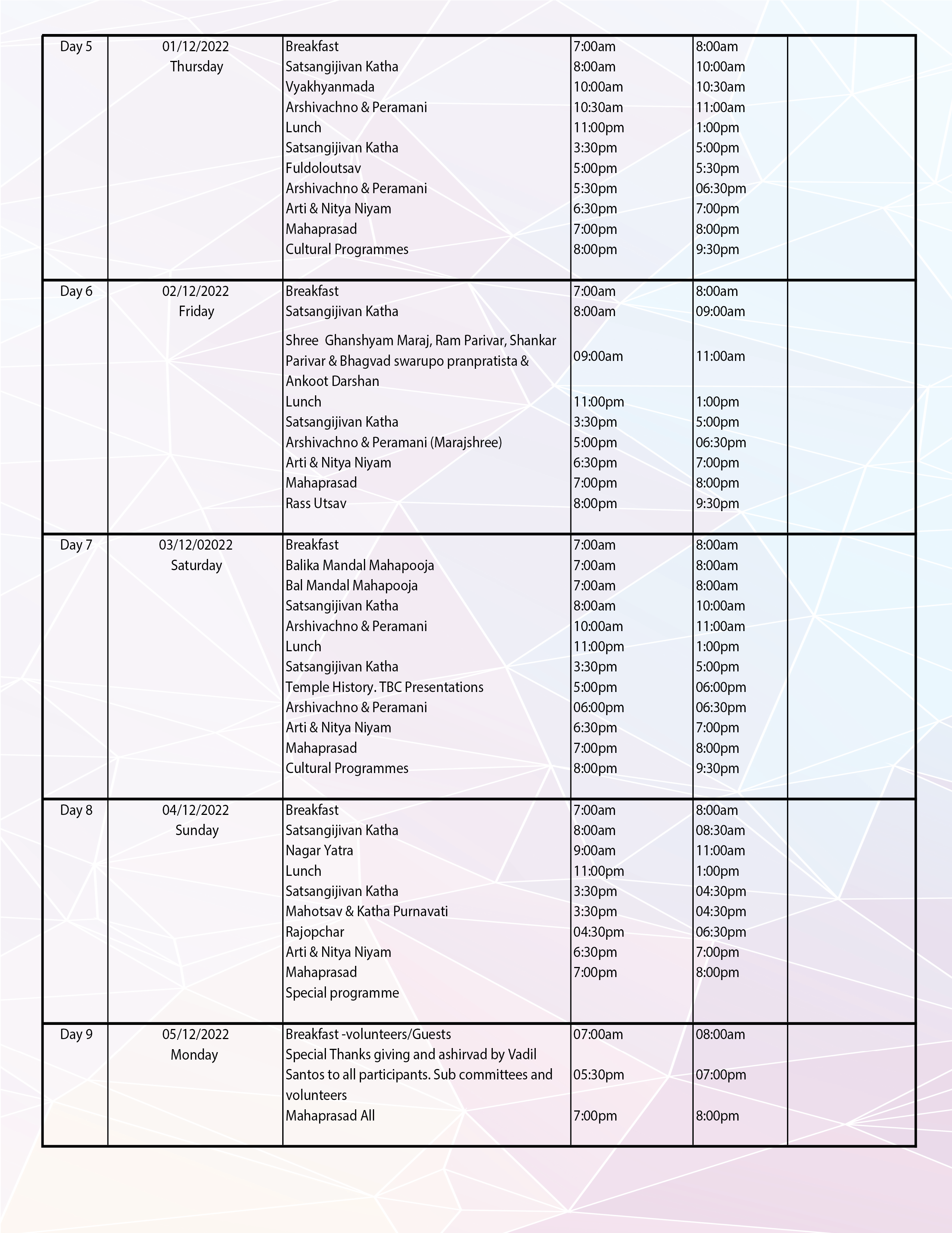 A choice of affordable accommodation facilities within reasonable proximity to the Temple has been negotiated by the organizers for the duration of the Mahotsav dates. The accommodation facilities are available strictly on a first come first served basis and therefore it is highly advisable to book as soon as possible.