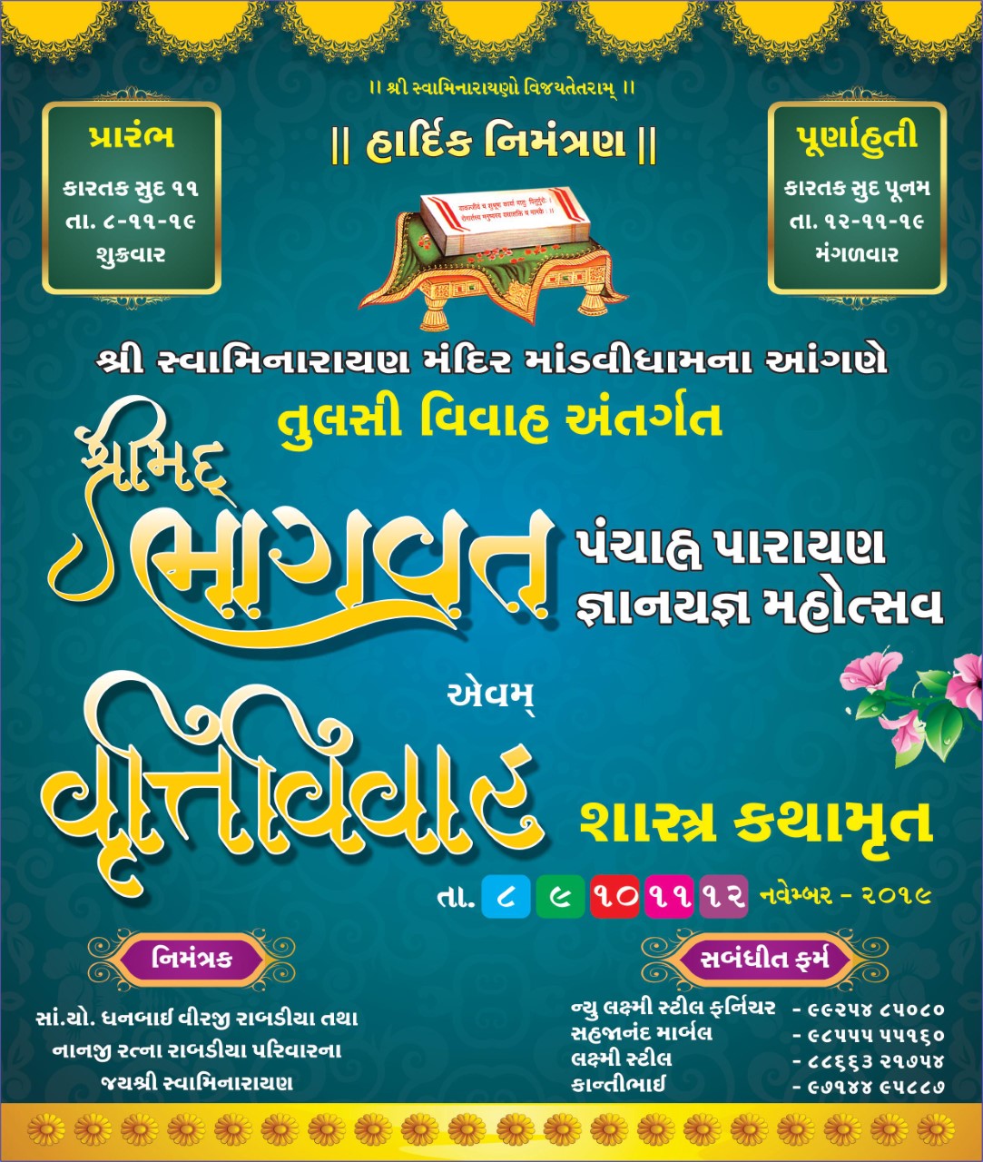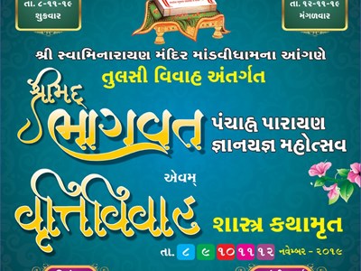 A five day parayan will be held during the auspicious time of Tulsi Vivaah whereby Shrimad Bhagwat and Vrutti Vivaah will be recited by learned saints from Bhuj Temple.