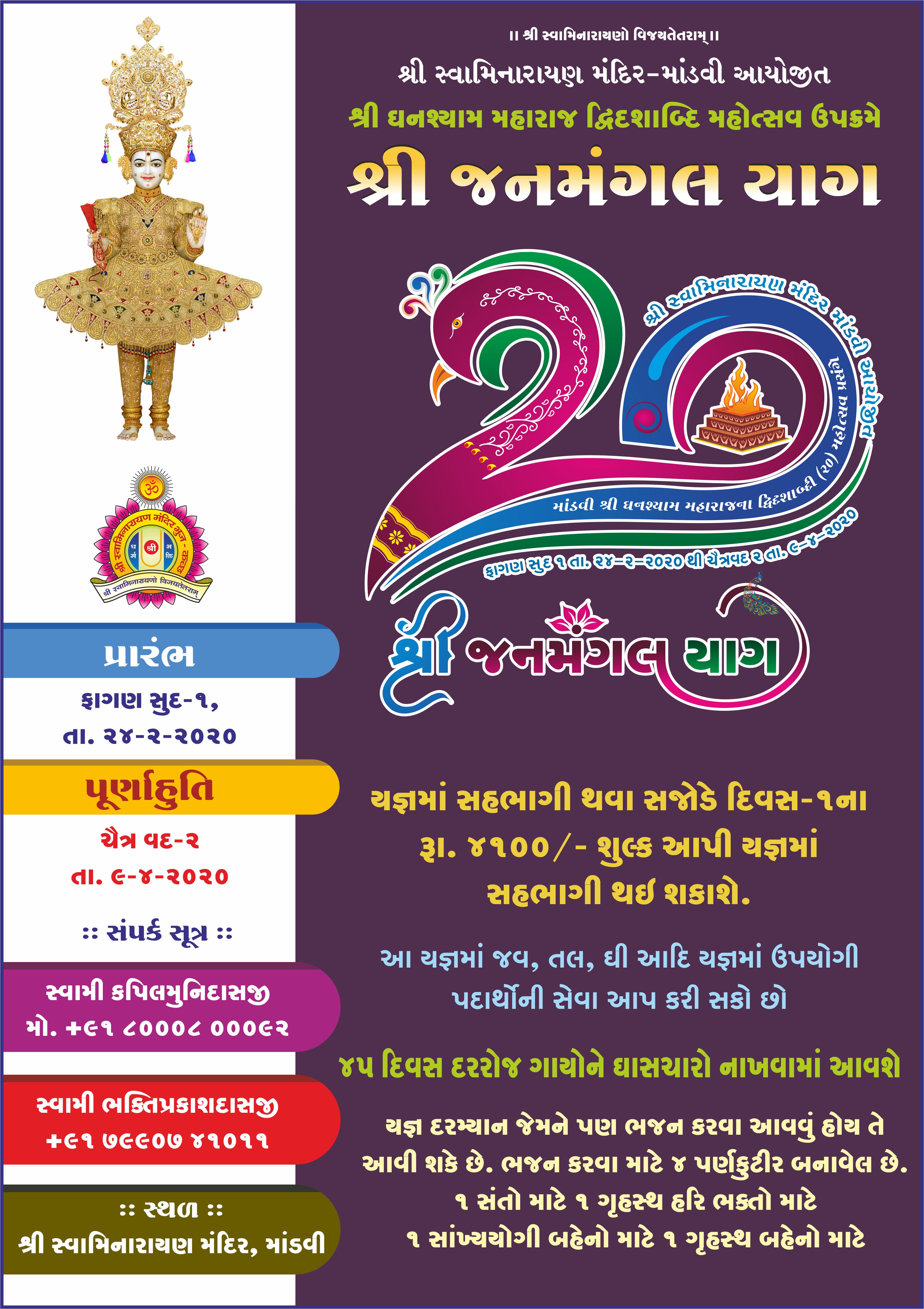 In celebration of 20 years of Ghanshyam Maharaj at Mandvi Temple, a Bhakti Yagna will be held on a large scale for a period of 45 days consecutively. A yagna of this magnitude has probably never been offered to the Lord in Kutch before. Learned saints and Brahmins from across the country, as well as devotees from all around the World will come together for this utsav to please the Lord. As part of the yagna, Janmangal will be recited along with many other offerings. Our mother cows will also be fed for the entire 45 days of this yagna.