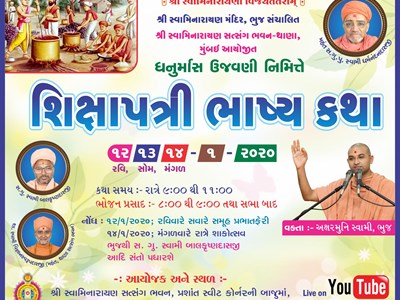 To celebrate the pious period of Dhanurmaas, a three day Shikshapatri Bhashya will be recited. Prabhatferi and Saak Utsav will also be celebrated in the company of Maharaj Santos and Bhaktos.