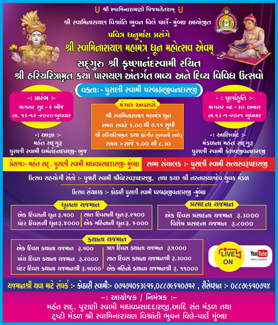 In the auspicious month of Dhanurmaas there will be a Mahamantra dhun every morning from 6am to 7.15am. In the evenings there will be a Shree Haricharitramrut Katha read from 6.00pm to 8.30pm. Katha will be read by Purani Swami Parbrahmjivan Dasji.