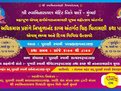 On the auspicious month of Adhik Maas Mumbai Vile Parle Temple will be doing daily recital of Chin Chintamani Katha from 18th September 2020 - 16th October 2020, 6pm to 8pm IST