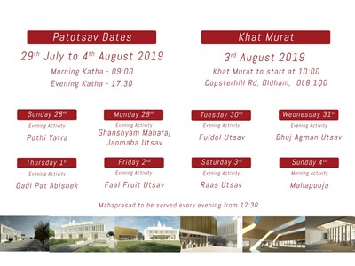 Shree Swaminarayan Mandir Oldham will be celebrating their 42nd Patotsav from Monday 29th July 2019 to Sunday 4th August 2019. Abhishek will be performed on Friday 2nd August 2019 followed by Ankoot Darshan. During this event, Khat Murat will be held on Saturday 3rd August 2019 at the New Mandir site on Copsterhill Road and will be graced by Bhuj Mandir Mahant Swami along with over 25 santos.