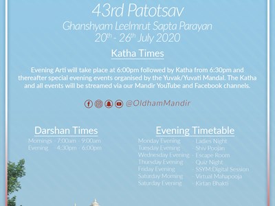 With the current COVID-19 situation this year Shree Swaminarayan Mandir Oldham will be celebrating their 43rd Patotsav virtually each evening from Monday 20th July 2020 to Sunday 26th July 2020. Abhishek will be performed on Wednesday 22nd July 2020 followed by Ankoot Darshan. During this event a Nutan Mandir Prarambh Vidhi & Ground Breaking Ceremony will be held on Wednesday 22nd July 2020 at the New Mandir site on Copsterhill Road.