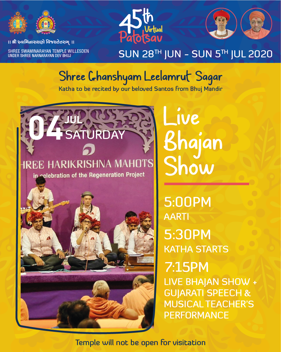 Join us every evening from Sunday 28th June 2020 to Sunday 5th July 2020 for an insightful delve into the amazing Ghanshyam Leelamrut Sagar recital by our Santos from Bhuj. There will be cultural events, performances, quizzes, dramas, discussions, dance, music, singing and a lot more for you to enjoy!