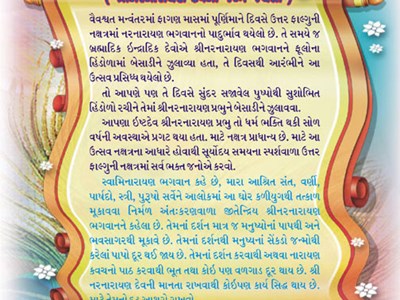 In our temples we celebrate this festival in a similar way to Vasant Panchmi, where coloured water is sprayed on devotees. A swing is made and decorated with flowers on which the Nar Narayan Dev murti is placed and devotees gently sway the swing. Poojan of Nar Narayan Dev is performed followed by an Aarti. Songs associated with the festival are sung accompanied by musical instruments. Similar to Vasant Panchmi prashad of popcorn is served. Narnarayandev Jayanti is the only birth of the Lord where fasting is not required.