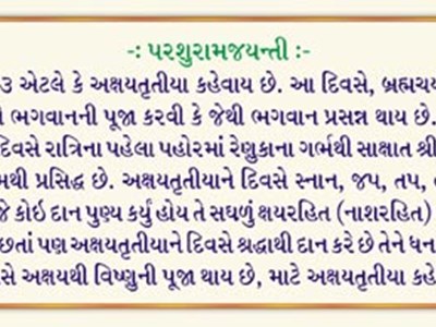 Parshuram Jayanti is the appearance day of Lord Parshuram, the sixth incarnation of Lord Vishnu. It is observed on Tritiya, the third day waxing moon in the month of Vaishaka (April-May). The day is also called Akshaya Tritiya. Parshuram Bhagwan was born on this day and he got his name Parshuram because he used a Parshu (an axe) to kill all the Kshatriyas on earth. Parshuram means the bearer of an axe.