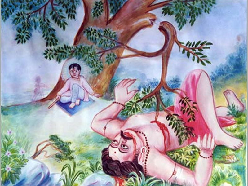 Kalidatta took this opportunity, He created such an illusion that he fell with a mountainous body on the tree under which GHANSHYAM was sitting. That mango tree fell on Ghanshyam. It did fall, but it was not wicked like Kalidatta. The tree fell on Ghanshyam covering him safely like an umbrella. Now Ghanshyam had full protection against the storm and rain. Kalidatta was stunned. He rushed again to grab [ a hold of ] him, when he saw that Ghanshyam was alive. But no sooner did his eyes meet with Ghanshyam’s began to run helter skelter like a possessed man. He was crushed tham he under a tree that was falling in the cyclone and died.