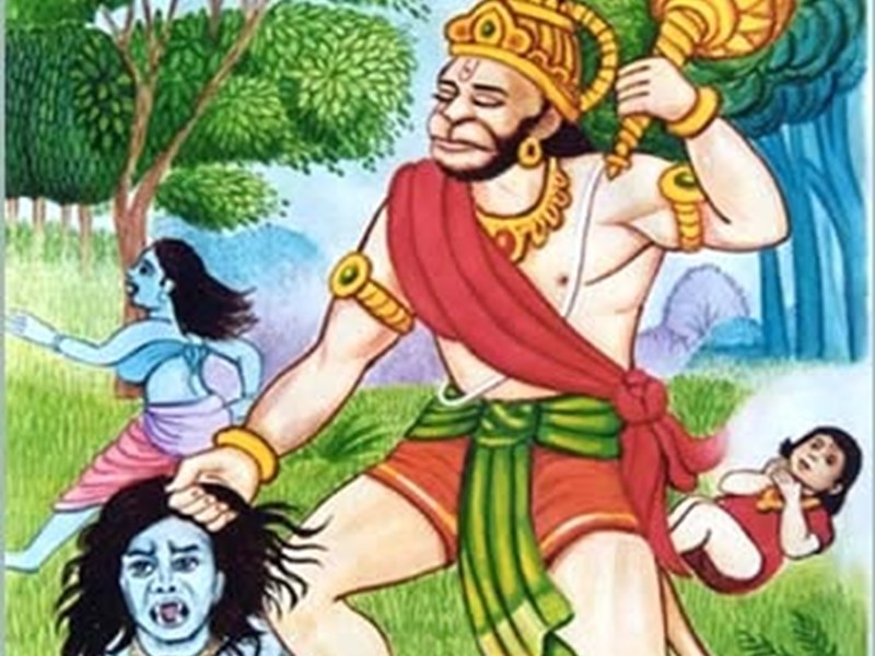 Hanumanji took a leap at that time. He caught hold of Kotara. Kotara gnshing her teeth, was, at that time, about to raise a weapon, the TRISHUL. She was about to strike the child. At that same moment, Hanumanji appeared there with a roar of “Jai Shri Rama.” The weapon -TRISHUL- gave way from Kotara’s hand when she saw Hanumanji. She ran to save her life. Hanumanji gave a sweep of his big tail at those sorceresses running away.